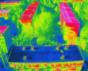 fot. Vimaks | Zdjęcia z kamery termowizyjnej bloku w Łodzi po zastosowaniu na dachu budynku powłoki termoizolacyjnej BAUTER.