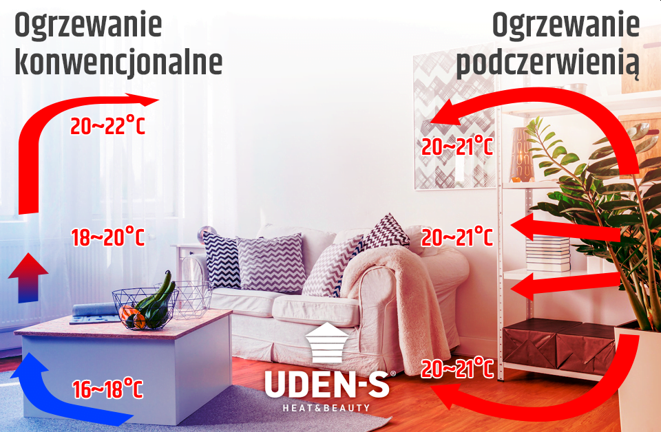 Zwolenników ogrzewania na podczerwień przekonują nie tylko niskie koszty eksploatacji, ale coraz częściej także proekologiczność oraz wysoki komfort cieplny. Zwłaszcza ten ostatni aspekt ma duże znaczenie, bo w przypadku konwencjonalnych grzejników najpierw ogrzewa się powietrze, następnie zaś ściany, podłogi, przedmioty i ludzie. Rozkład temperatur nie jest równomierny, bo ciepło emitowane przez kaloryfer unosi się do góry, przemieszcza na drugi koniec pomieszczenia, a następnie dołem wraca w stronę grzejnika. W sposób oczywisty przekłada się na odczuwany przez osoby przebywające w pomieszczeniu komfort cieplny. Ponadto konwekcyjny ruch powietrza powoduje unoszenie się kurzu, co jest szczególnie niekorzystne dla alergików i astmatyków.