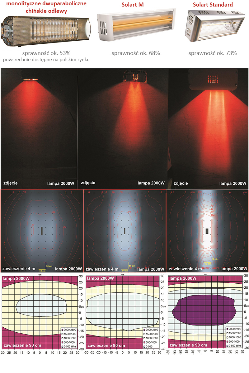 Skuteczność promienników SOLART jest ponad 50% większa od powszechnie dostępnych na polskim rynku promienników ( w tym reeksport produktów chińskich z Niemiec) , wykonanych z ciężkich odlewów aluminiowych, które jednocześnie są reflektorami dla lampy. Reflektory w tego typu konstrukcjach nie posiadają powierzchni refleksyjnej , absorbują duże ilości ciepła produkowanego przez lampę i dodatkowo rozpraszają i tak słabą wiązkę ciepła. Obecnie głównym producentem tego typu promienników są Chiny.