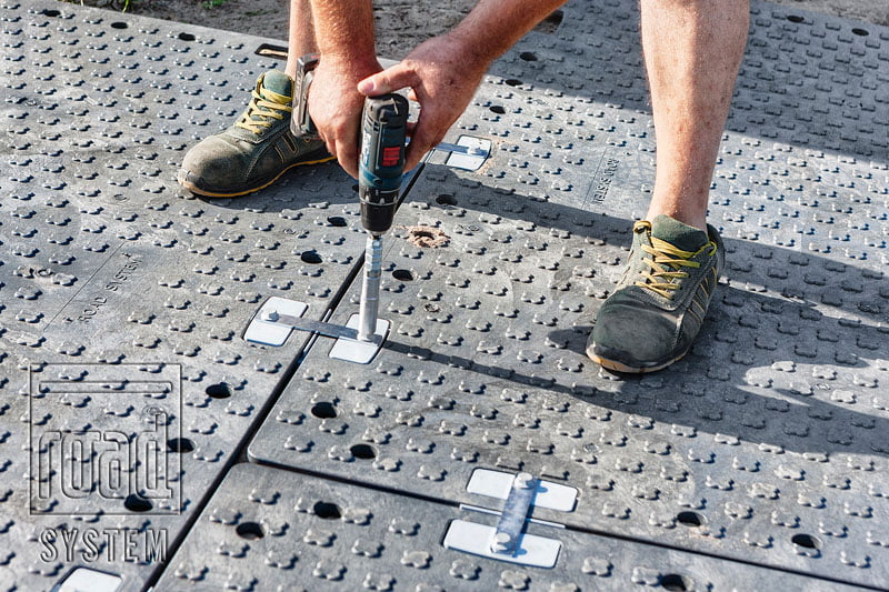 Niezaprzeczalnym atutem produktu jest prosty i szybki montaż dla każdego rodzaju zastosowania. Pojedyncze płyty drogowe z tworzywa sztucznego ROAD SYSTEM spinają ze sobą w większe struktury nawierzchni specjalne łączniki, mocowane do płyt przy pomocy dwóch śrub. System łączników uwzględnia minimalne dylatacje, powstające na skutek naturalnie występujących pod wpływem nacisku i warunków atmosferycznych procesów kurczenia się lub rozszerzania tworzywa sztucznego, z którego wykonane są płyty ROAD SYSTEM. Przed montażem nie trzeba wykonywać specjalnej podbudowy, zaleca się jednak układanie dróg tymczasowych na wyrównanej powierzchni. W przypadku terenu bagiennego, grząskiego lub błotnistego pomocne jest zastosowanie geowłókniny drogowej (np. Typar SF49) jako stabilizatora podłoża pod płyty drogowe.
