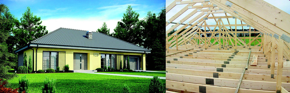 Jakie są inne zalety takiego rozwiązania? Obok aspektów ekonomicznych związanych z obniżeniem kosztów inwestycji, dach domu parterowego wykonany z wiązarów daje o wiele większe możliwości. Można uzyskać duże, otwarte przestrzenie i zaaranżować np. salon o wymiarach 10×10 metrów.