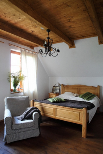 – Oferowane przez nas domy swoim kształtem i stylem wykonania nawiązują do regionalnych form budownictwa, na przykład do chat w stylu kurpiowskim czy tradycyjnych mazurskich chatek z bali. Jesteśmy też w stanie odtworzyć starą konstrukcję drewnianą oraz odzyskać jej niepowtarzalny styl i charakter. Stawiamy na tradycyjne metody budowy. Ściany zewnętrzne to konstrukcje wieńcowe, gdzie jeden bal ułożony jest na drugim, a następnie wiązane są w rogach węzłem w tzw. jaskółczy ogon. Ściany szczytowe poddasza powstają dzięki szkieletowi drewnianemu. Jest on od zewnątrz obity deską. Wykonanie więźby dachowej to konstrukcja krokwiowo-jętkowa (krokwie wpuszczone są w murłatę) – mówi Dariusz Guliński.
