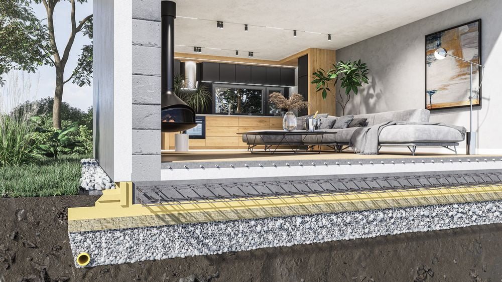 Slab System, jako autorytet rozwiązań z użyciem szalunków traconych płyt fundamentowych, zwraca również uwagę na materiał, z jakiego wykonywana jest podbudowa, szczególnie w trudnych terenach z wysokim poziomem wód gruntowych lub gruntach wysadzinowych. Jak zauważa, nie warto decydować się na najtańsze wysiewki z dużą ilością gliny, ponieważ trudno dobrze je zagęścić, kiedy pojawia się w nich woda. Na terenach Polski południowej preferuje podbudowy z dolomitu lub innych twardych kruszyw, które stanowią stabilne oparcie dla budynku. Za każdym razem stosuje geowłókninę i praktycznie zawsze odprowadza wodę z podbudowy, aby chronić ją przed podmywaniem. Dużą oszczędnością dla klienta jest brak przegłębienia obwodowego podbudowy na głębokość strefy przemarzania, co jest częstym nawykiem wykonawców. Dobrze zaprojektowana opaska przeciwwysadzinowa chroni podbudowę przed przemarzaniem, przez co nie ma sensu wymieniać tak dużej ilości gruntu po obrysie płyty.
