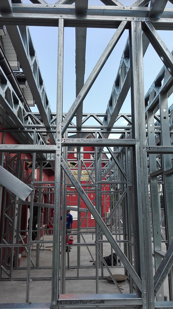Cała konstrukcja opiera się na dwóch podstawowych elementach, czyli panelach ściennych/dachowych oraz belkach stropowych. Panele i belki wykonane są z zimnogiętych kształtowników, których profil grubości wynosi od 0,95mm do 1,60mm. Pozwala to na tworzenie wielu form konstrukcyjnych, o różnej wielkości. Wszystkie elementy prefabrykowane są ściśle do siebie dopasowane i łączone przy użyciu wkrętów samowiercących. Taka technologia zdecydowanie przyspiesza prace budowlane i zmniejsza straty materiałowe, a także minimalizuje możliwość błędów i pomyłek.
