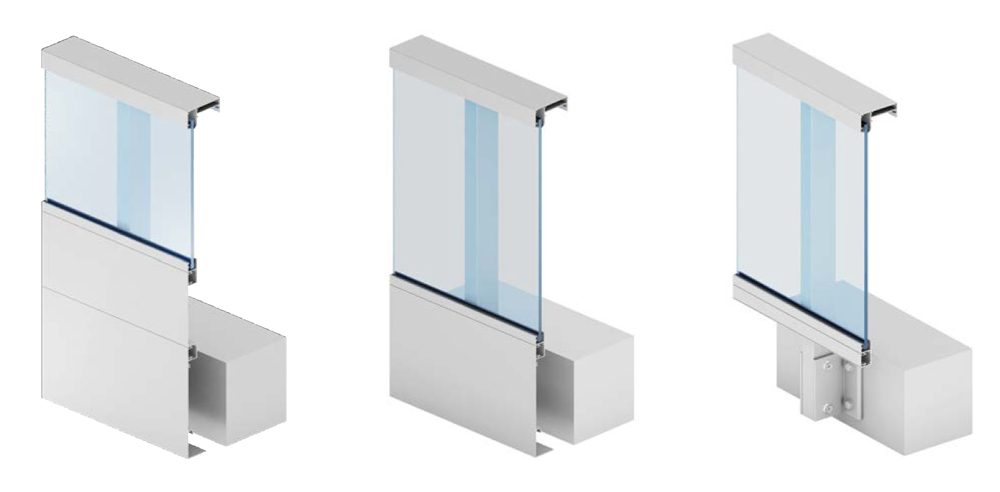 Balustrada RAILING z wypełnieniem szklanym z blendą i dodatkowym podwyższeniem maskującym warstwy płyty balkonowej (po lewej), z blendą i bez podwyższenia (w środku) oraz RAILING z wypełnieniem szklanym bez blendy (po prawej). Fot. Aliplast