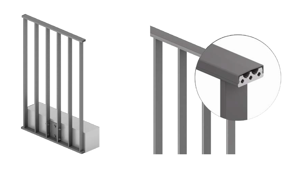 Podstawą systemu balustrad aluminiowych RAILING jest modułowa konstrukcja nośna: słupki mocowane przy użyciu konsol umożliwiają dopasowanie balustrady do założeń projektowych. RAILING oferuje szeroką paletę wypełnień – od pionowych układów szczebli z profili aluminiowych, przez wypełnienia szklane, po warianty panelowe. System występuje również jako poręcze mocowane do ścian, co pozwala utrzymać jednolity charakter rozwiązań w różnych strefach budynku.