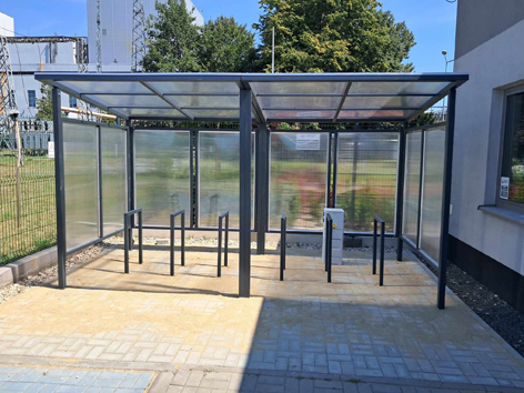 Jaworzno – montaż wiaty MODE przy firmie. Osłonięte stojaki porządkują parkowanie rowerów i zachęcają więcej osób do przejazdów jednośladami. (31.07.2024)