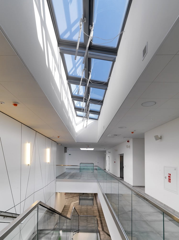 Warto zaznaczyć, że w przypadku tego obiektu system oddymiania jest wykorzystywany nie tylko w razie pożaru. Na co dzień okna wyposażone w napędy mogą być otwierane w celu wentylowania budynku. Dodatkowo w pomieszczeniach studia nagraniowego znajduje się świetlik dedykowany typowo do przewietrzania. Odpowiednia cyrkulacja świeżego powietrza i możliwość regulowania temperatury bez obciążania klimatyzacji mechanicznej to podstawowe korzyści takiego rozwiązania.